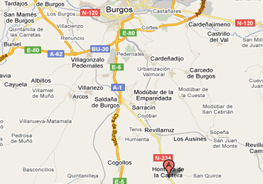 COMO LLEGAR Hontoria de la Cantera pertenece a la Comunidad Autónoma de Castilla y León, dentro de la provincia de Burgos. Situada a pocos kilómetros de la capital provincial, 20 km y saliendo de la misma, tomaremos la N-1 dirección sur hacia Madrid. Recorridos 9 Km. a mitad de camino, tomaremos el desvío hacia Soria a la derecha por la N-234 (Sagunto-Burgos). 10Km. despues y tras atravesar los pueblos de :Sarracin, Olmosalbos y Revillaruz llegaremos a Hontoria, que se divisará a la derecha. Antes de llegar a la entrada podremos ver a nuestra izquierda las ruinas de la Ermita de Sanlices.